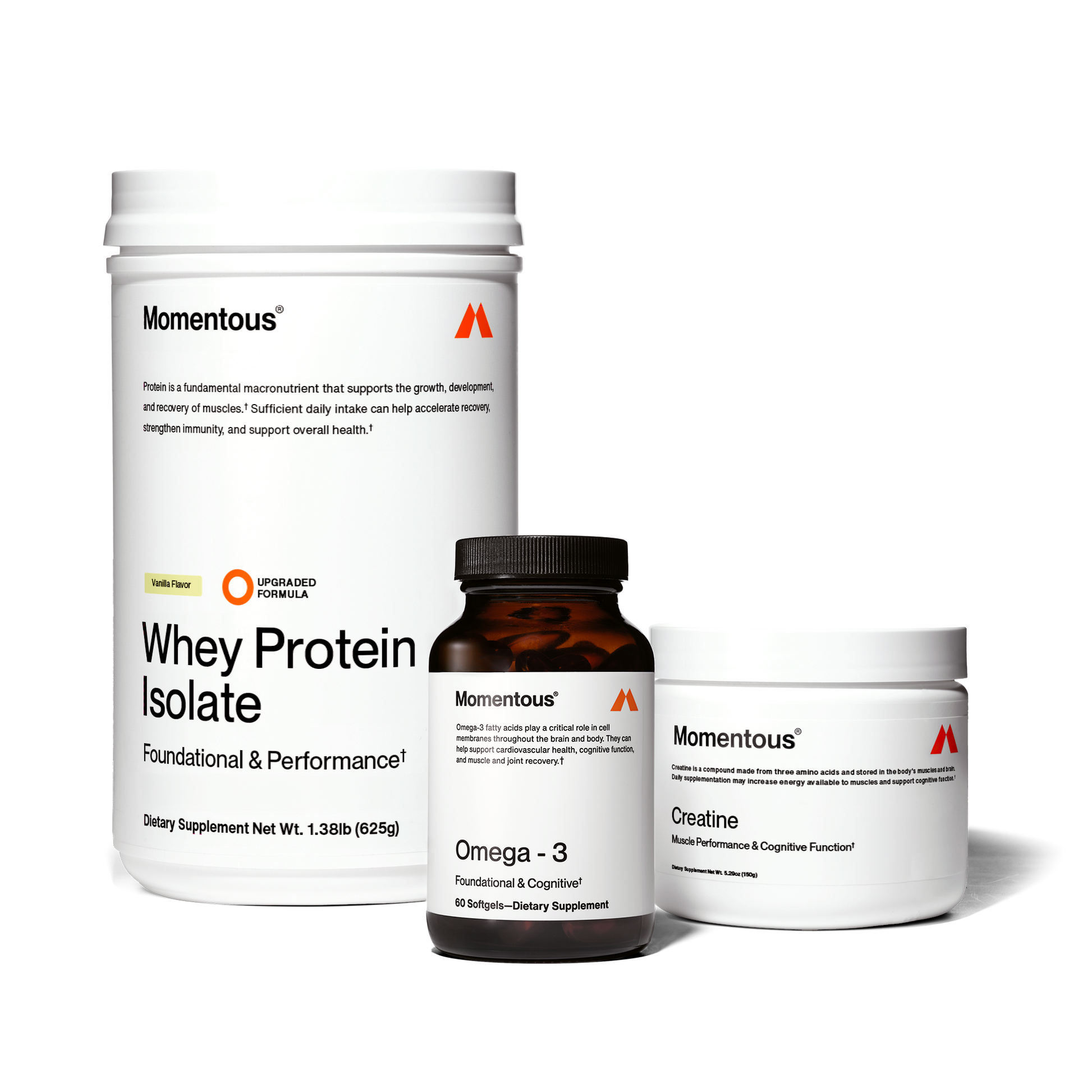 The Momentous Three combines Protein, Creatine, and Omega-3—three essential nutrients shown to support long-term health, performance, and cognitive function. This trio forms the foundation of daily supplementation for athletes, high performers, and anyone looking to improve energy, recovery, and mental clarity, giving performance for life™.